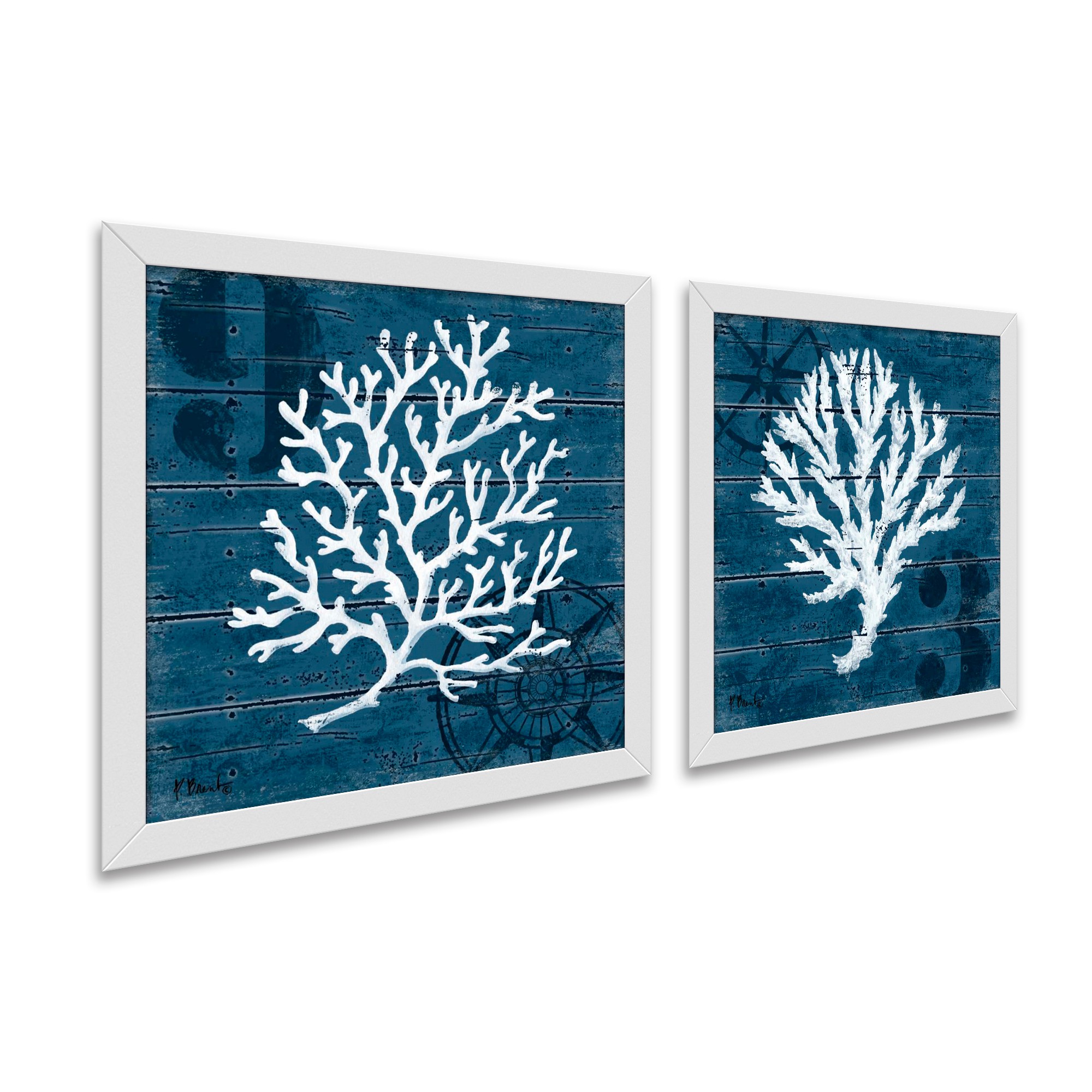 Kit 2 Quadros Decorativos Quadrado Azul Marinho Corais Mar Praia Vintage Pintura Madeira 21cm x 21cm