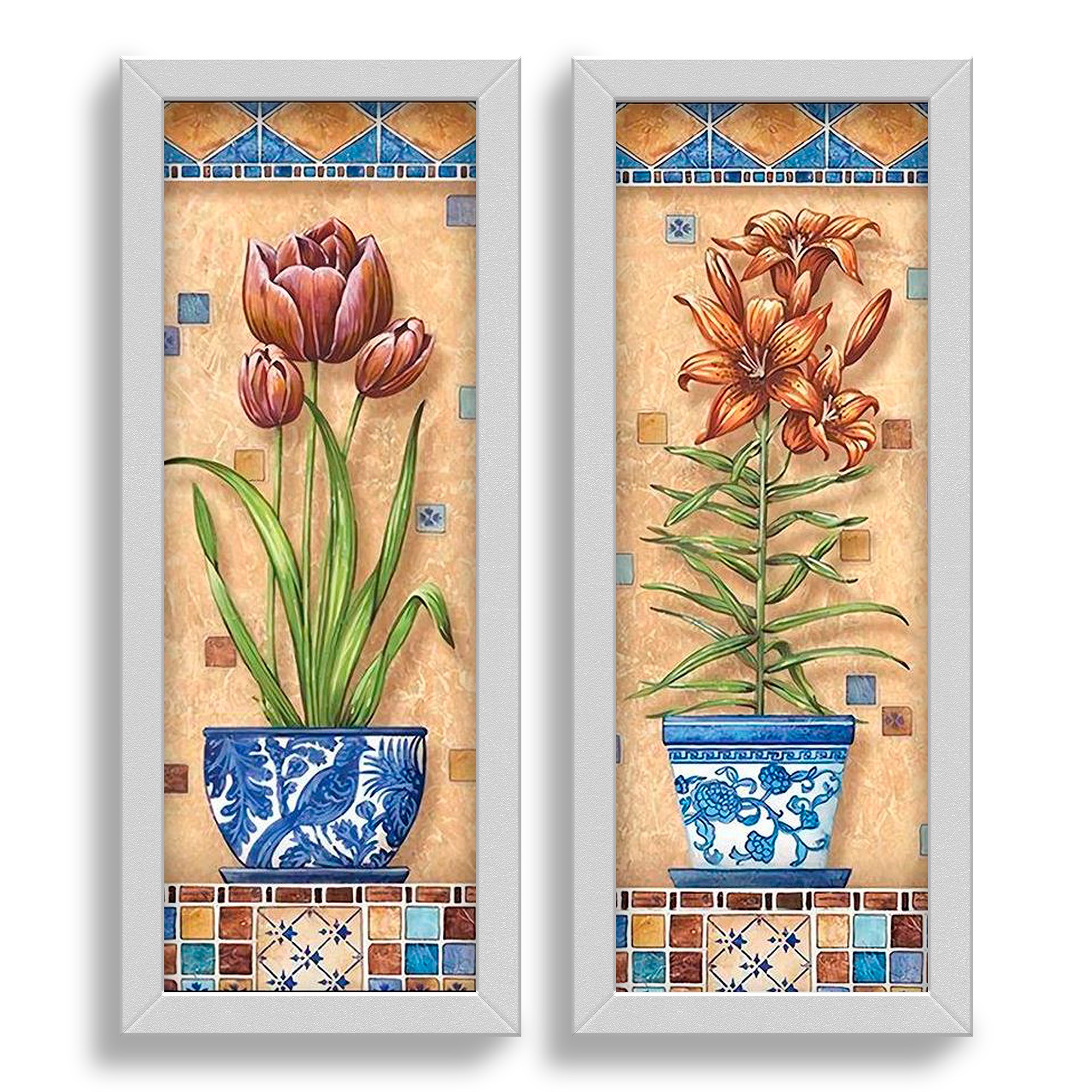 Kit 2 Quadros Decorativos Lavabo Banheiro Sala Cozinha Retro Vaso de Flores Vintage Bege Pintura Premium Elegante