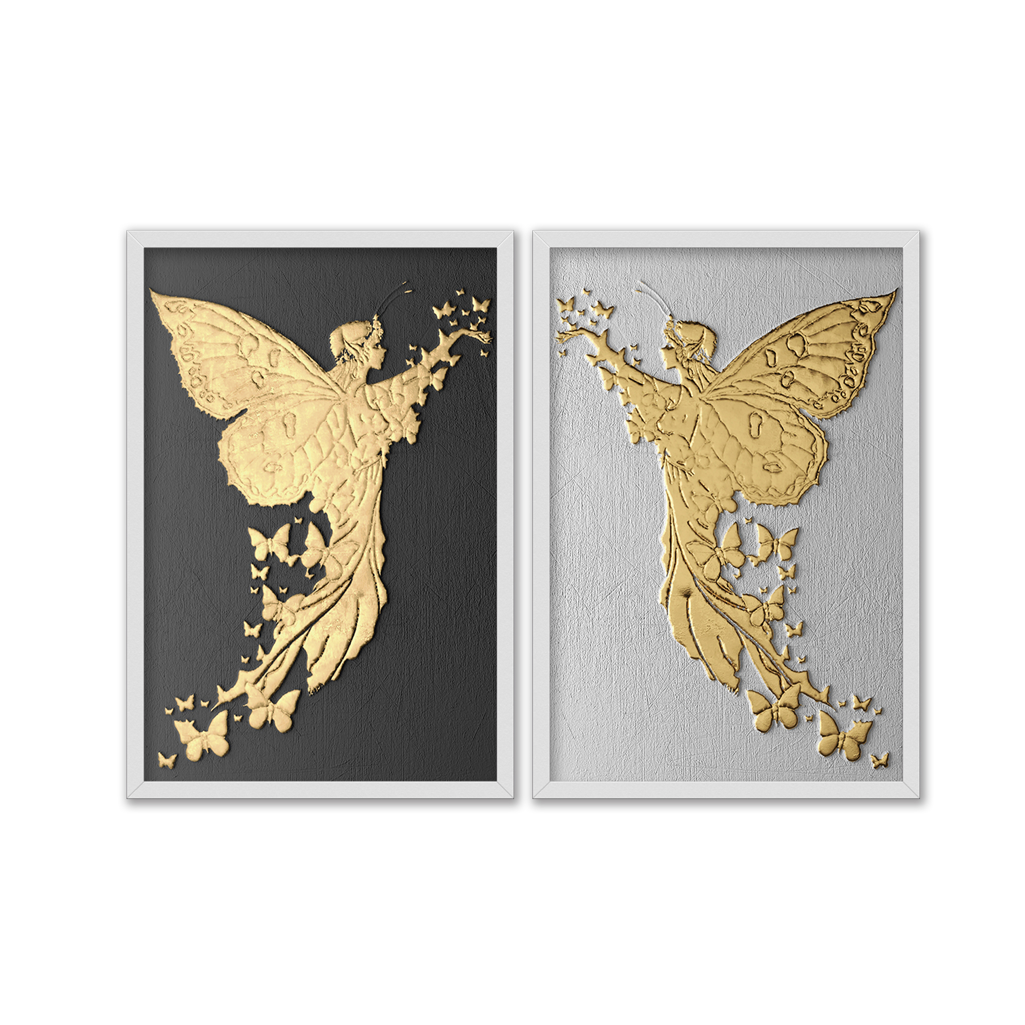 Kit Dois Quadros Decorativos Fada Dourada Preto E Branco