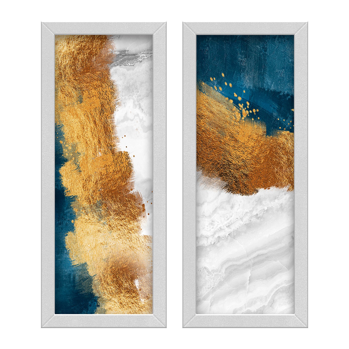 Kit 2 Quadros Lavabo Gold Dourado Azul Mármore Branco Sala