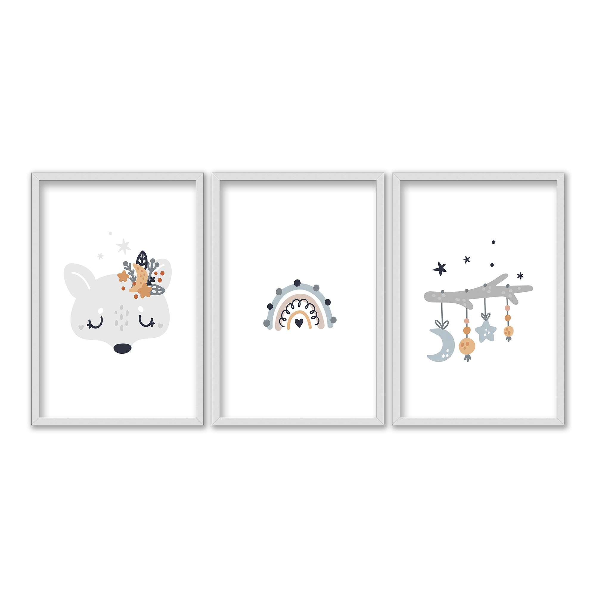 Kit 3 Quadros Decorativos Desenhos Fofos Infantis Bebê Cinza E Amarelo