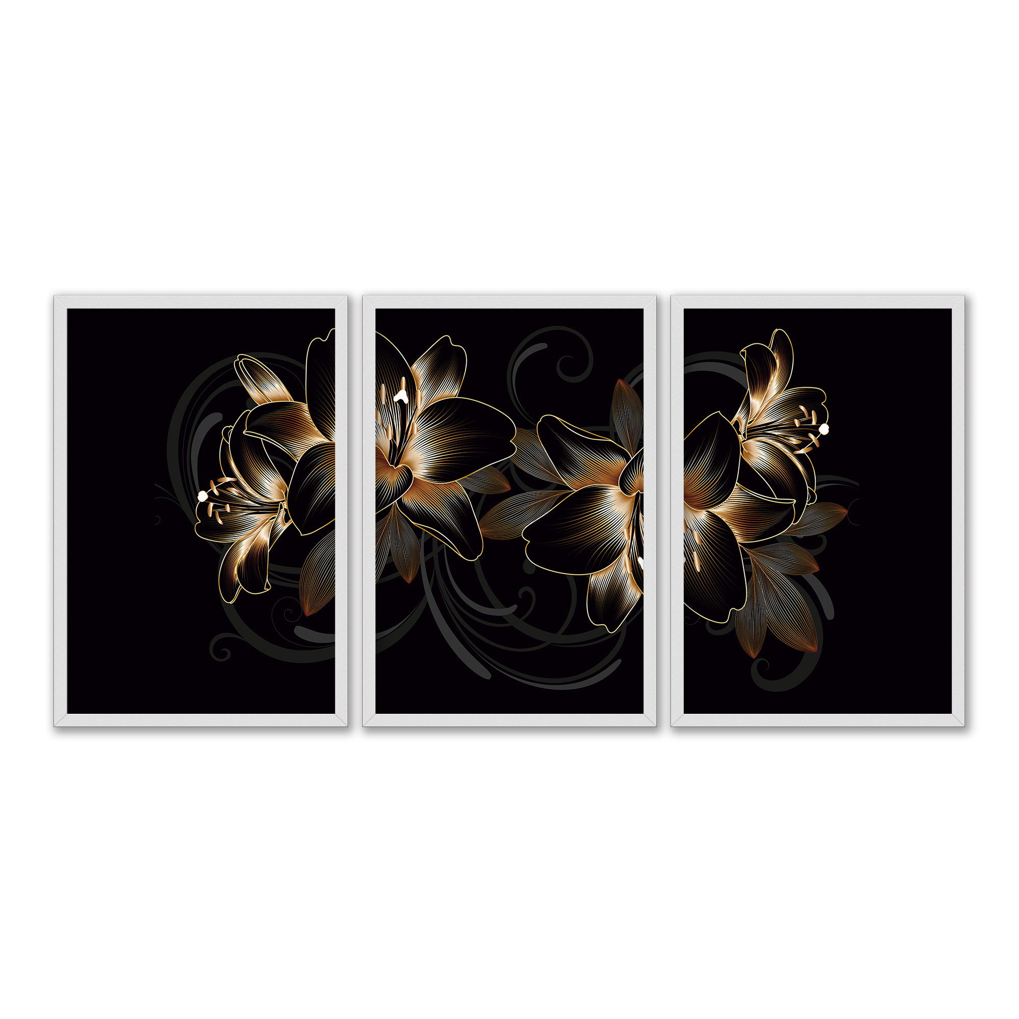 Kit 3 Quadros Decorativos Flores Douradas Fundo Preto Moderno