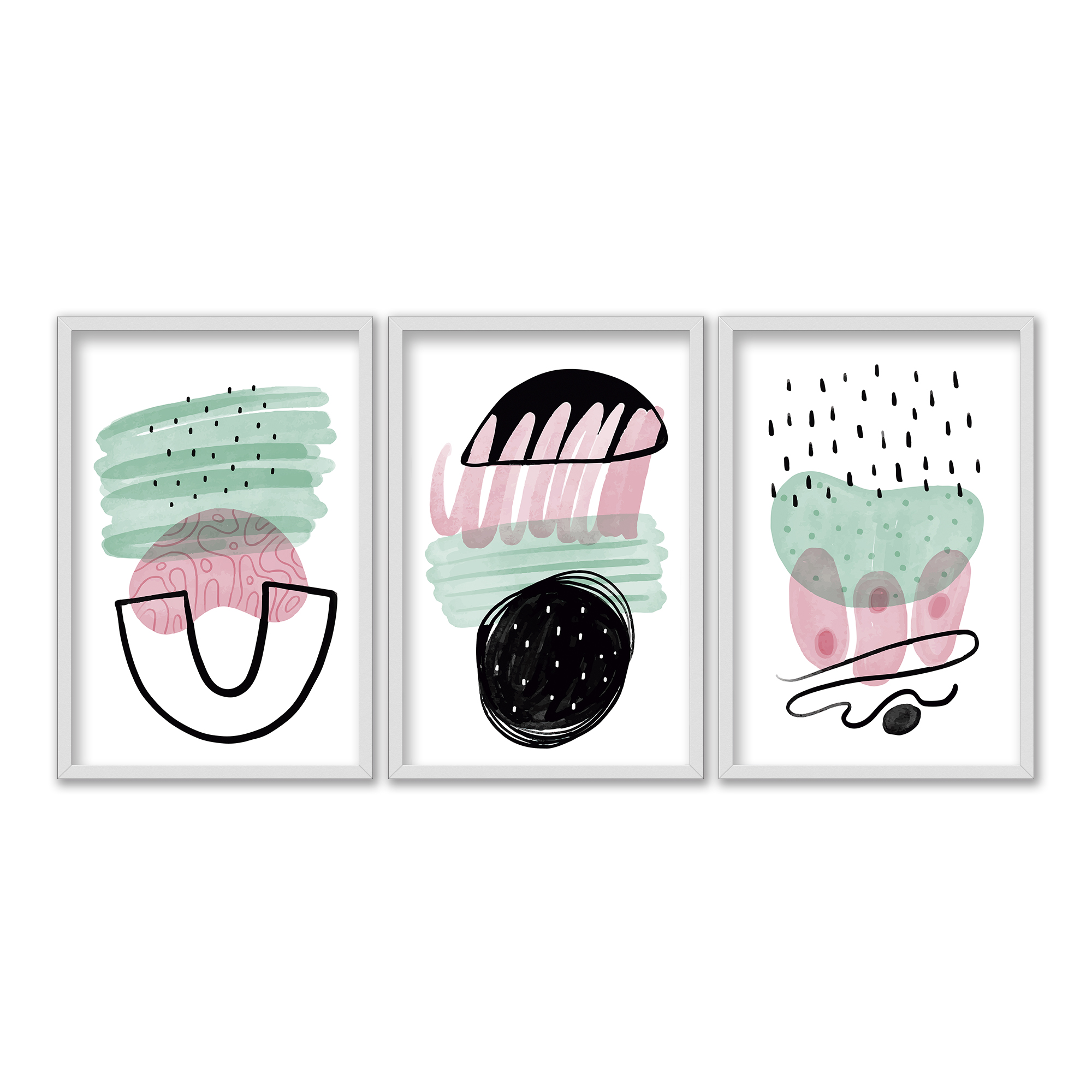 Kit 3 Quadros Decorativos Formas Orgânicas Abstradas Variadas Verde e Rosa