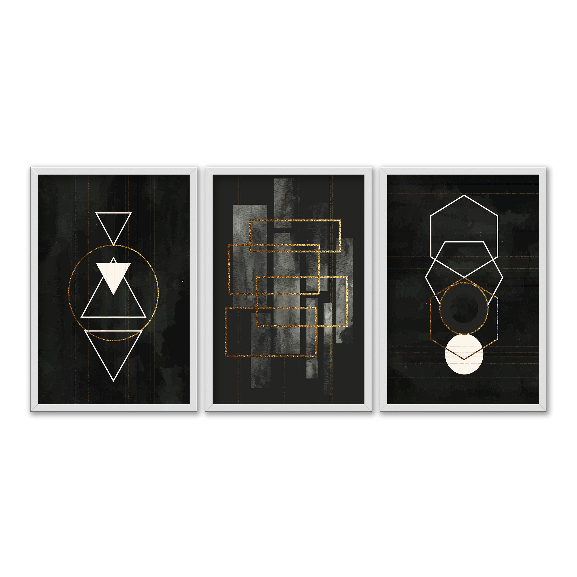 Kit 3 Quadros Decorativos Fundo Preto Contorno Formas Geométricas Detalhes Dourados