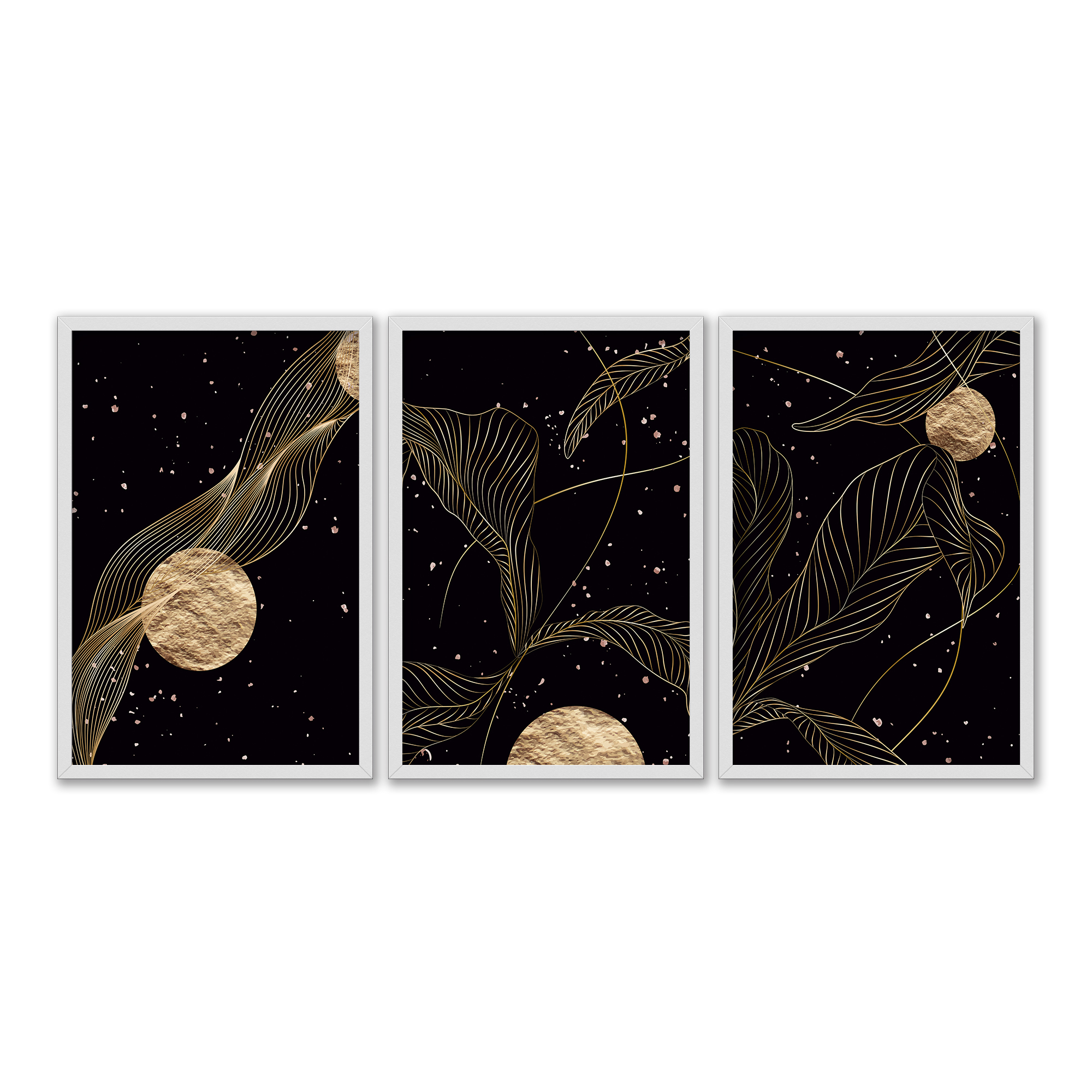 Kit 3 Quadros Decorativos Fundo Preto Pepitas de Ouro Linhas Douradas Abstratos