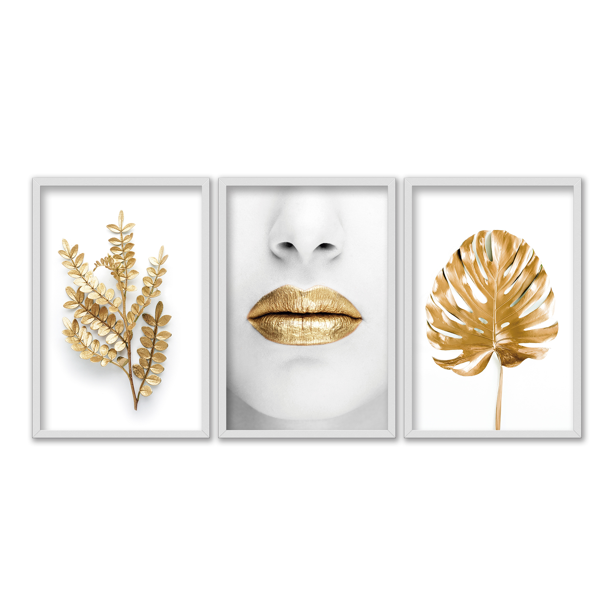 Kit 3 Quadros Decorativos Mulher Com Batom Dourado Plantas Douradas