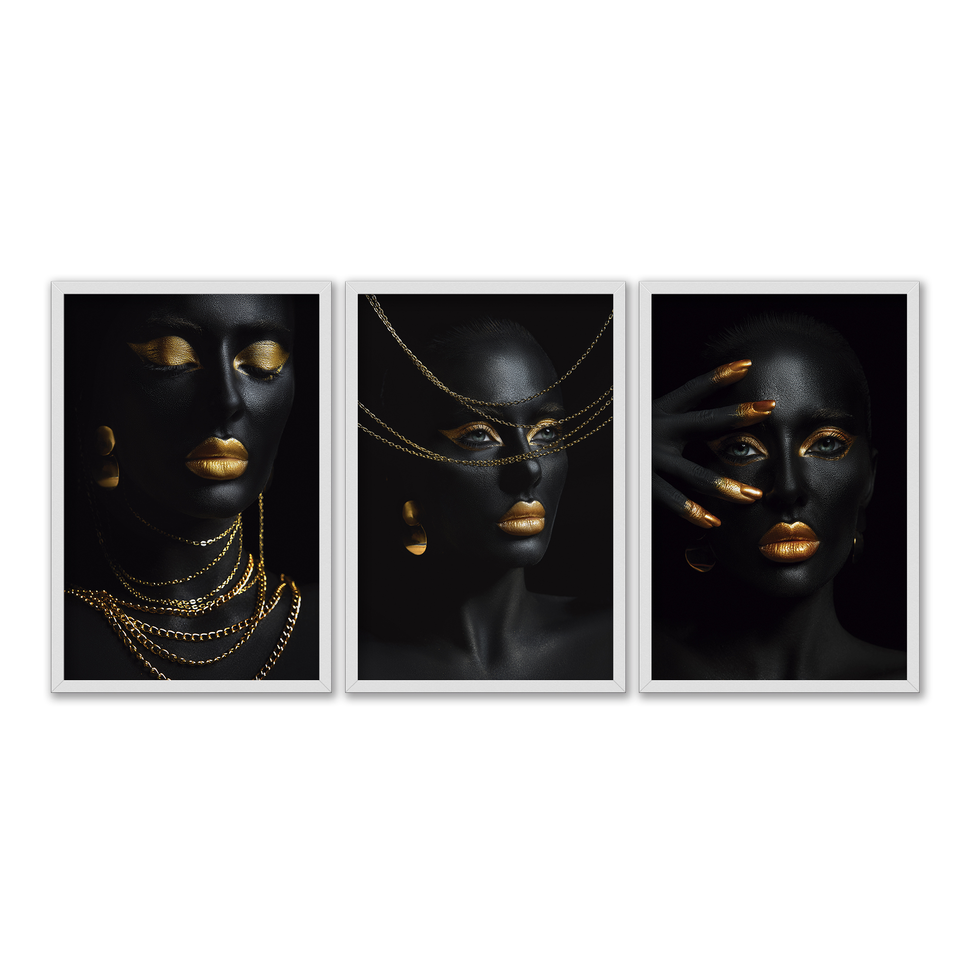 Kit 3 Quadros Decorativos Mulher Preto Tintura Dourada Colares Dourados Abstrato