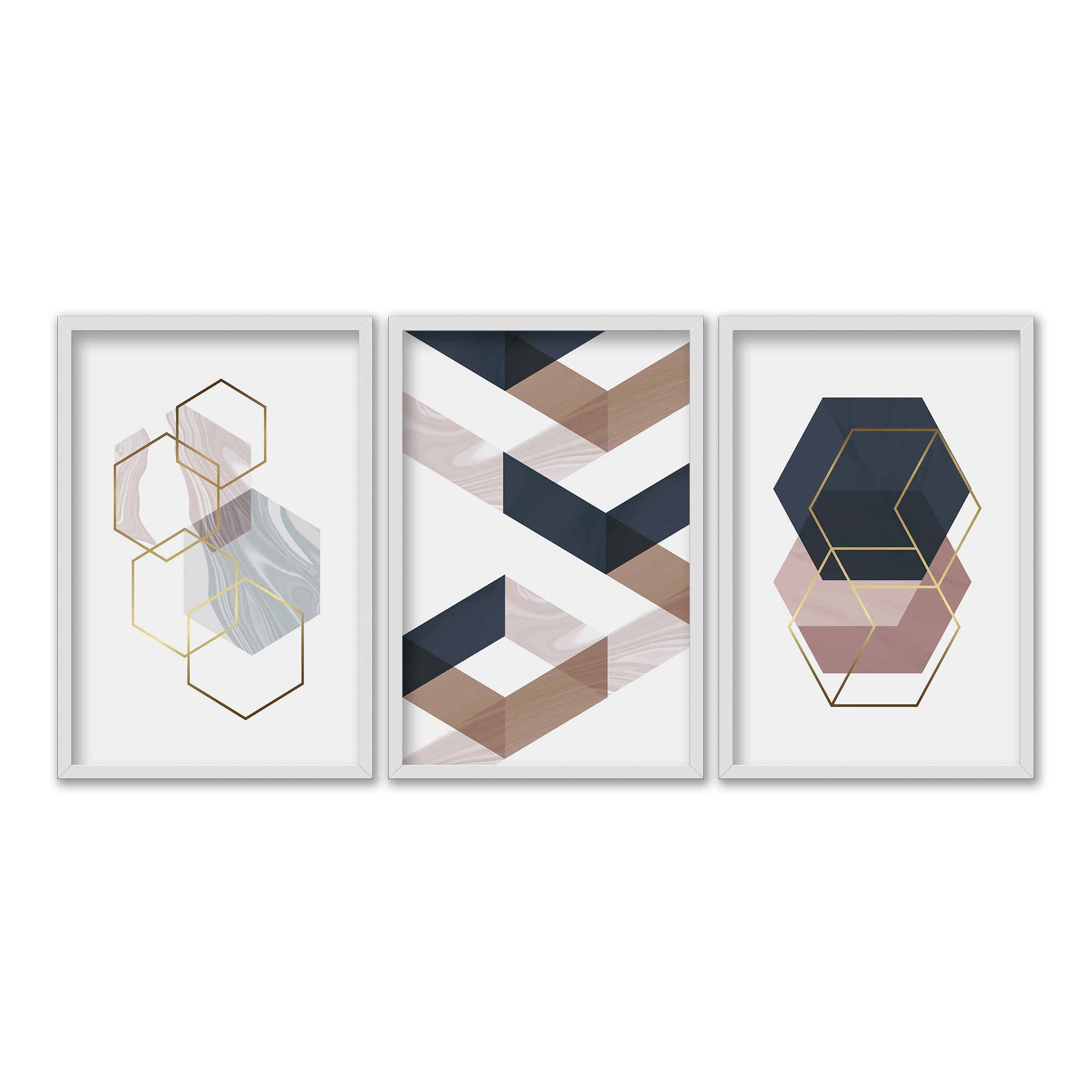 Kit 3 Quadros Decorativos Padrões Geométricos Faixas e Hexagonos