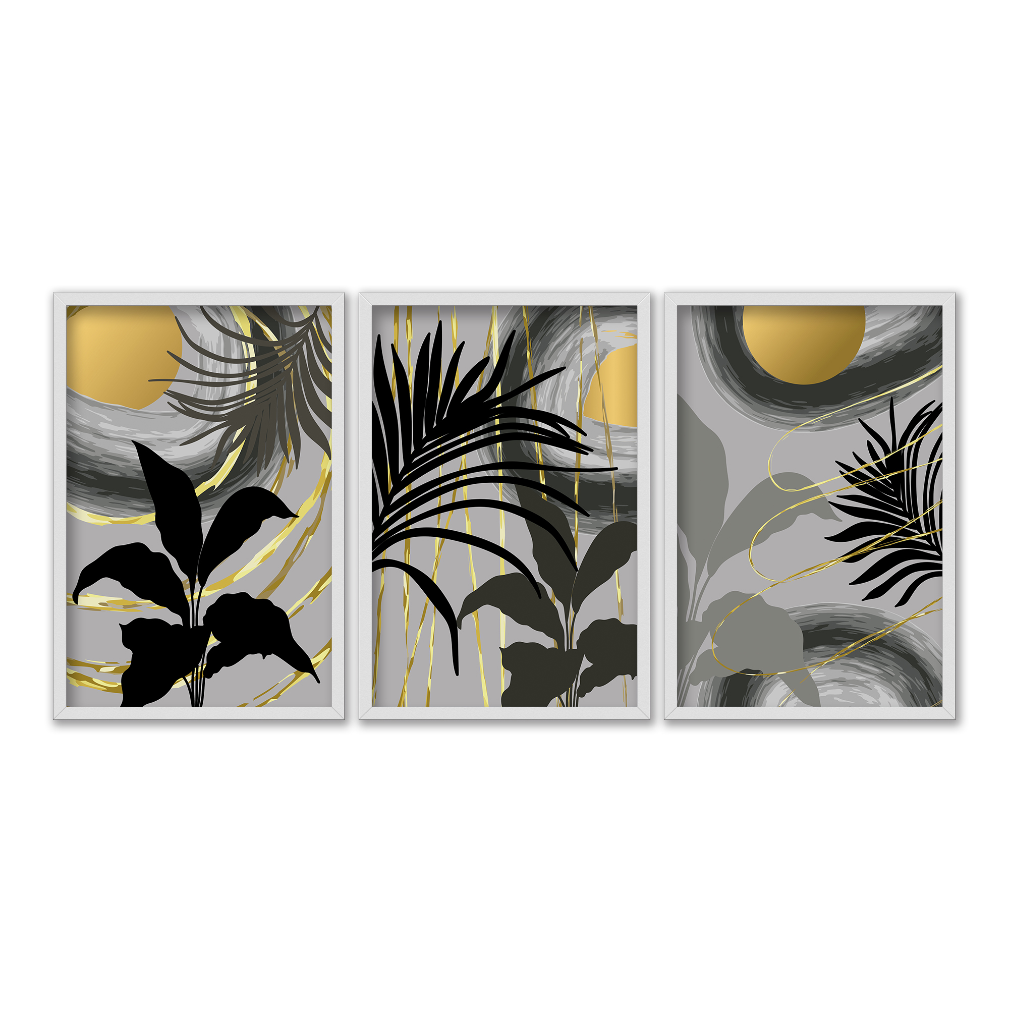 Kit 3 Quadros Decorativos Plantas Sol Amarelo Ao Fundo Detalhes Dourados Morderno