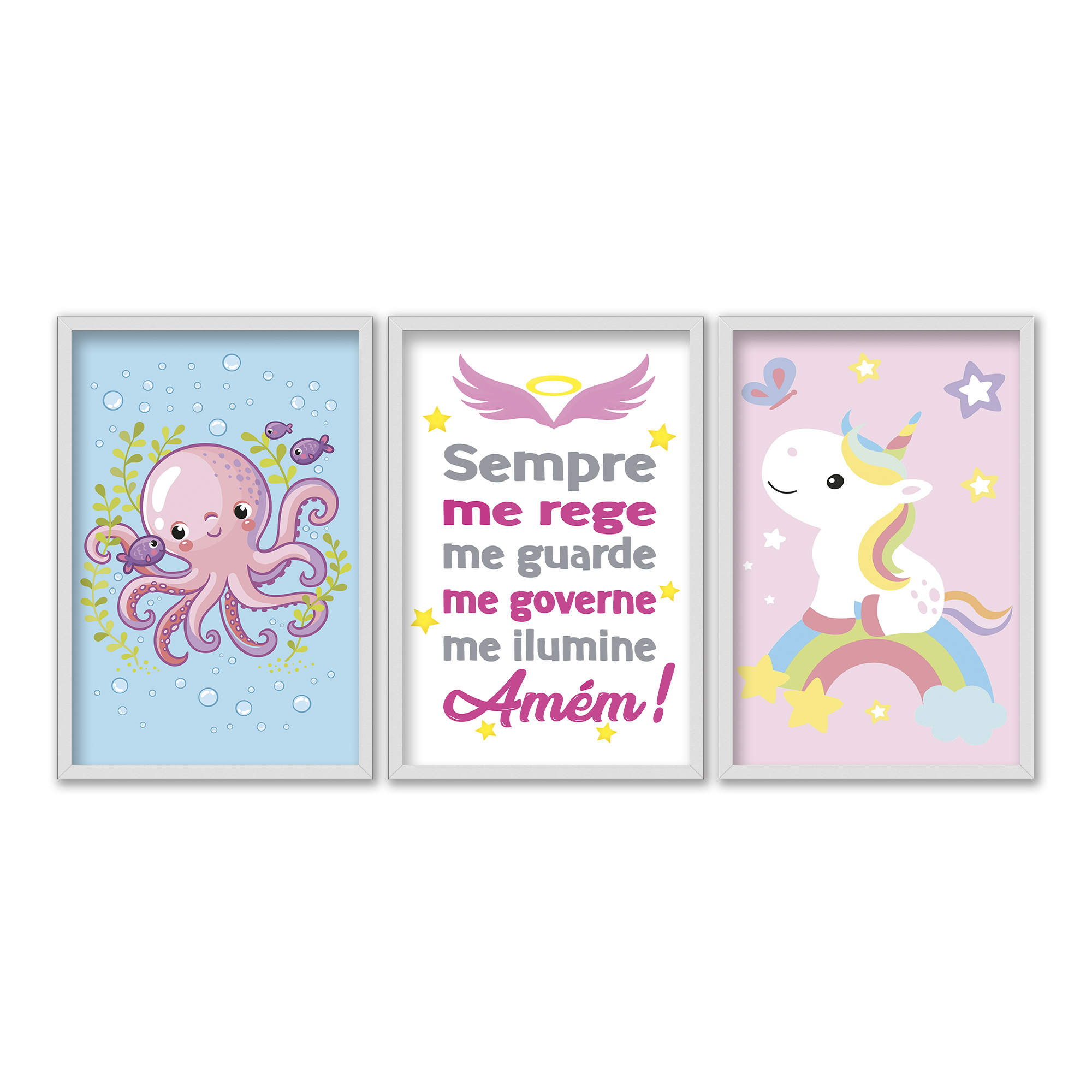 Kit 3 Quadros Decorativos Um Pôster Branco Com Um Anjo Rosa E Estrelas Amarelas