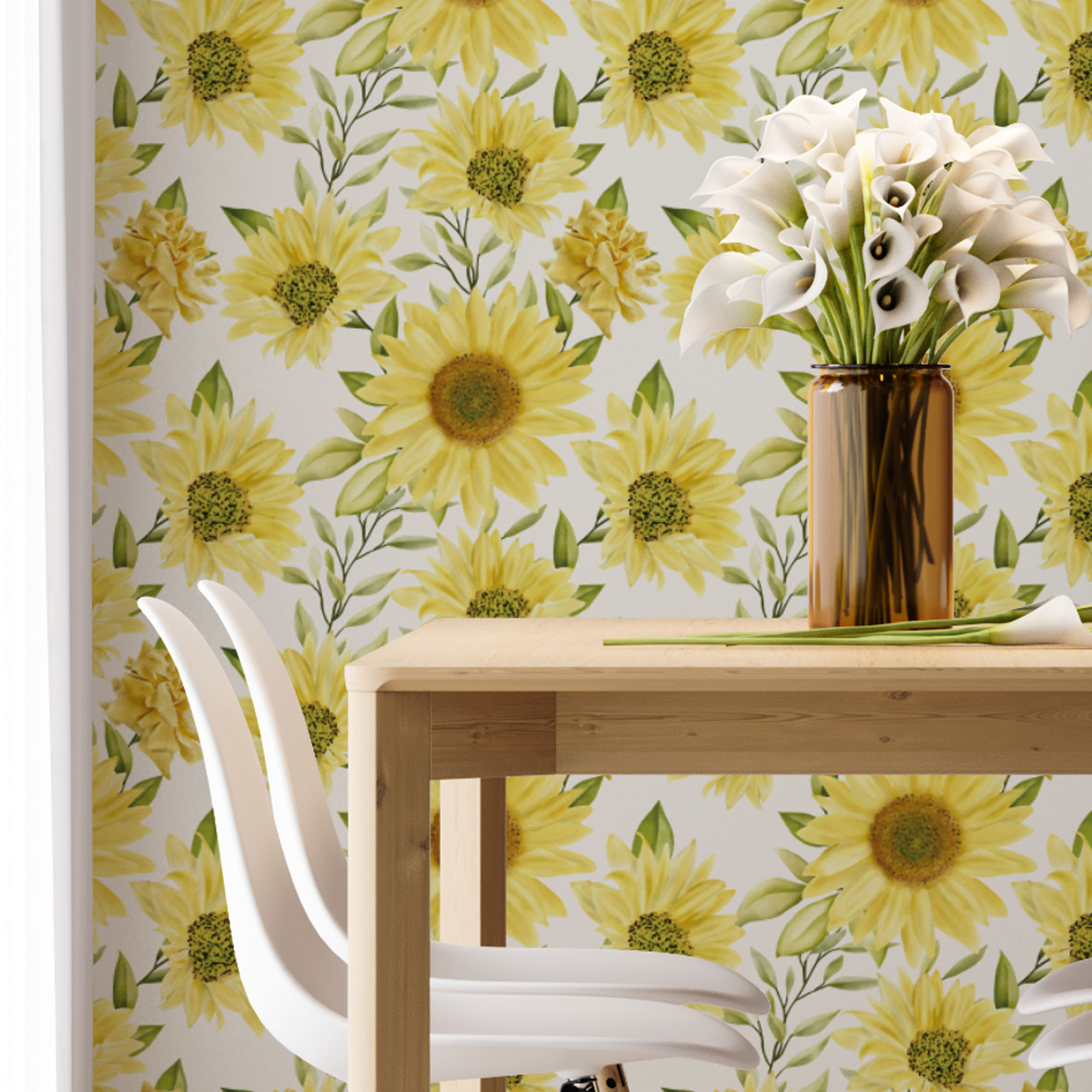 Papel de Parede Adesivo Vinil Girassois Amarelo Aquarela Vintage Cozinha Lavabo
