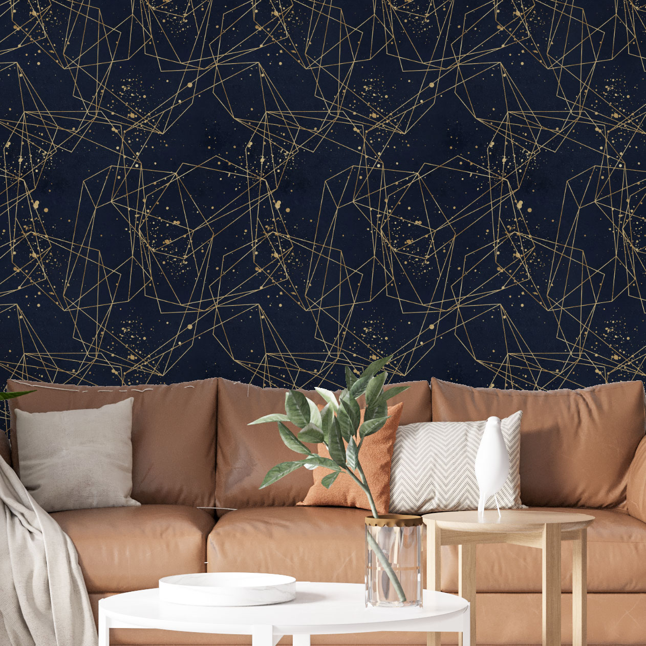 Papel de Parede Adesivo Vinil Abstrato Azul Linhas Douradas Elegante Sala Quarto