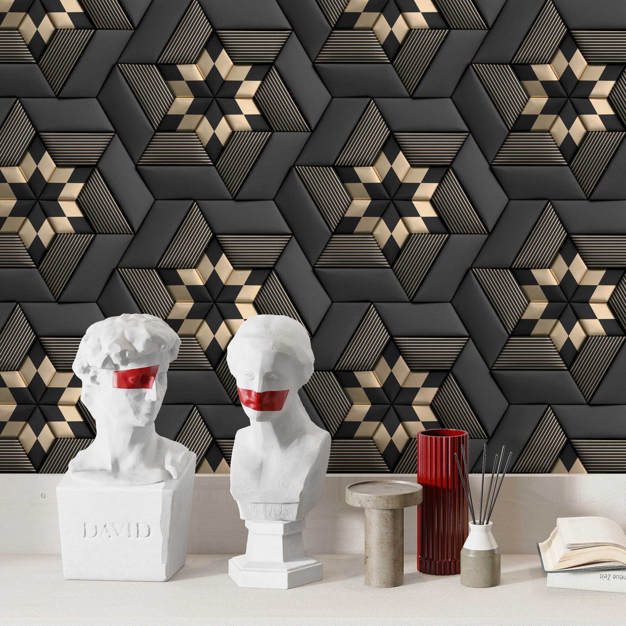 Papel de Parede Adesivo Vinil Efeito 3D Geométrico Gold Preto Grafite Sala Quarto