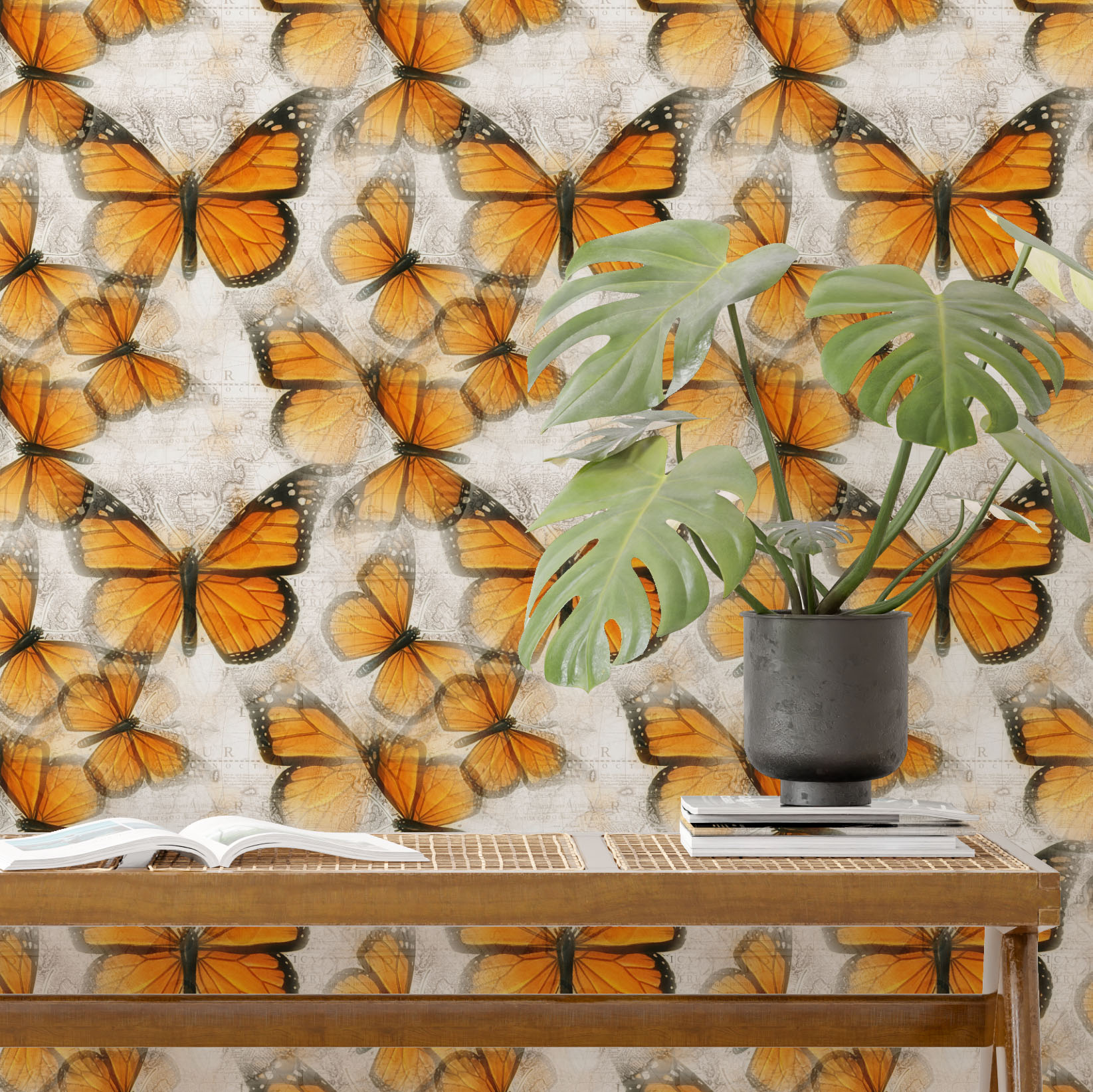 Papel de parede Autoadesivo Quarto Sombra De Borboleta Amarela Sobre Mapa Mundo Em Cor Bege