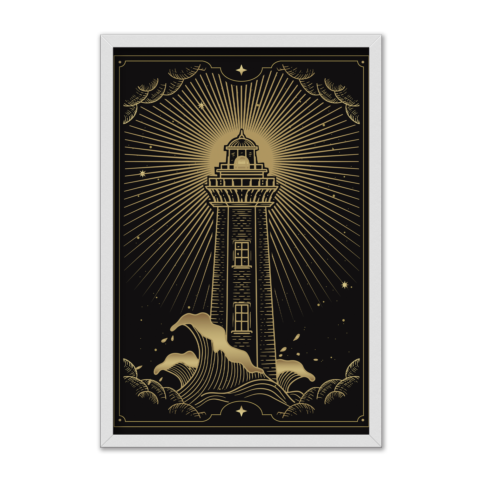 Quadro Decorativo Farol Fundo Preto Listras Douradas