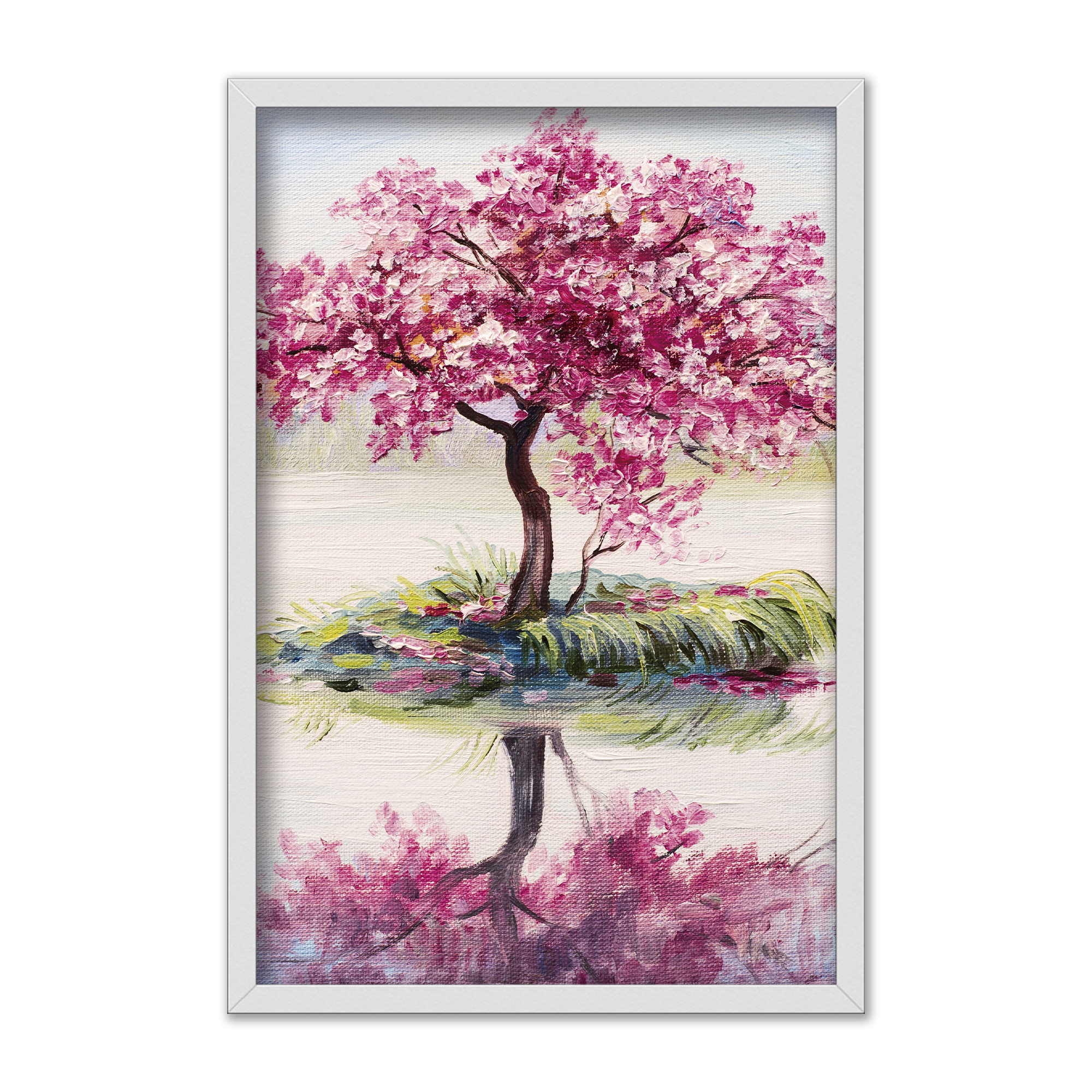Quadro Decorativo Efeito Pintura Árvore Ipê Rosa A Beira Do Lago